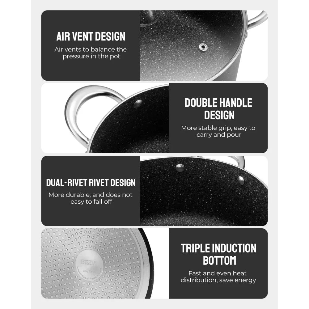 ROUGH GRANITE NONSTICK COATING - Our BEZIA pot features a rough granite nonstick coating, which ensures foods and sticky sauces don't stick to your pot while cooking. When you use BEZIA non-stick soup pot, youshould not need to spend time and effort scraping food off the walls or bottom of the pot.